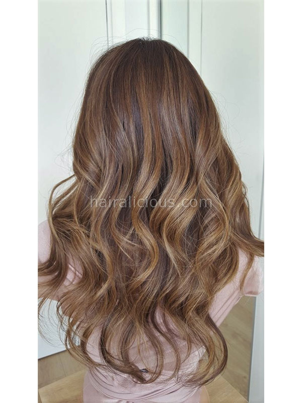 The highlighted brown hair color blends warmth and dimension, featuring vibrant money pieces that add dynamic accents to the overall look. This warm-toned shade offers a regular color dimension with a medium brown root base extending 5 inches as balayage roots. Darker roots maintain a consistent color level of 5-4, ensuring a harmonious blend from roots to tips. If you’re seeking a hair color that radiates warmth and depth with highlighted accents, this highlighted brown hue is a versatile choice, perfect for a natural and dynamic aesthetic.