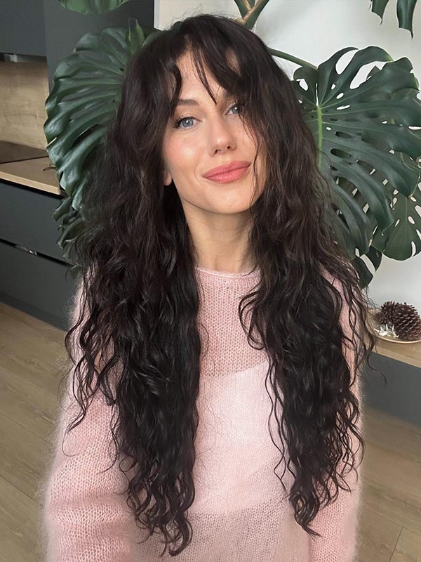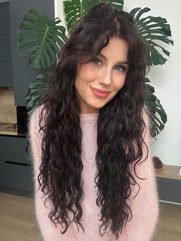 Long wavy wig in color “CARDI B” (extremely long) has the highest quality Brazilian single-drawn hair. If the glueless human hair wig doesn’t have thicker ends haircut or bob haircut, such hair gradually gets thinner towards the ends, replicating our natural hair look. Since this hair type is prone to waves, if you’re not planning to style it using heat tools and want to avoid any puffiness, follow these two simple steps:
