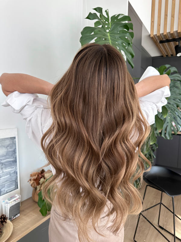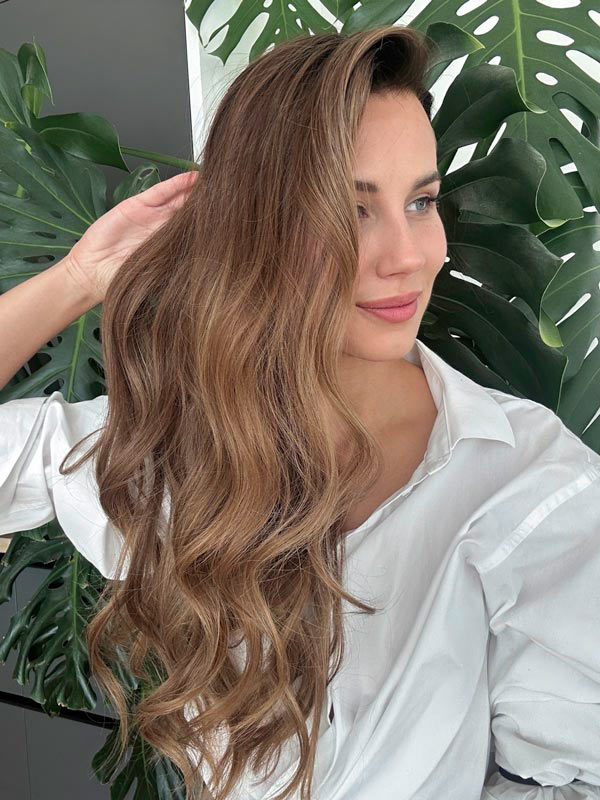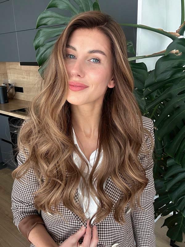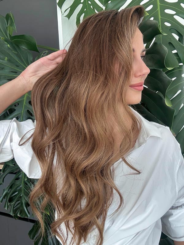 The highlighted brown hair color blends warmth and dimension, featuring vibrant money pieces that add dynamic accents to the overall look. This warm-toned shade offers a regular color dimension with a medium brown root base extending 5 inches as balayage roots. Darker roots maintain a consistent color level of 5-4, ensuring a harmonious blend from roots to tips. If you’re seeking a hair color that radiates warmth and depth with highlighted accents, this highlighted brown hue is a versatile choice, perfect for a natural and dynamic aesthetic.